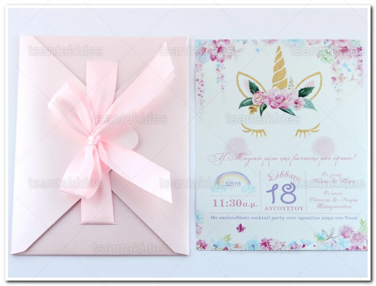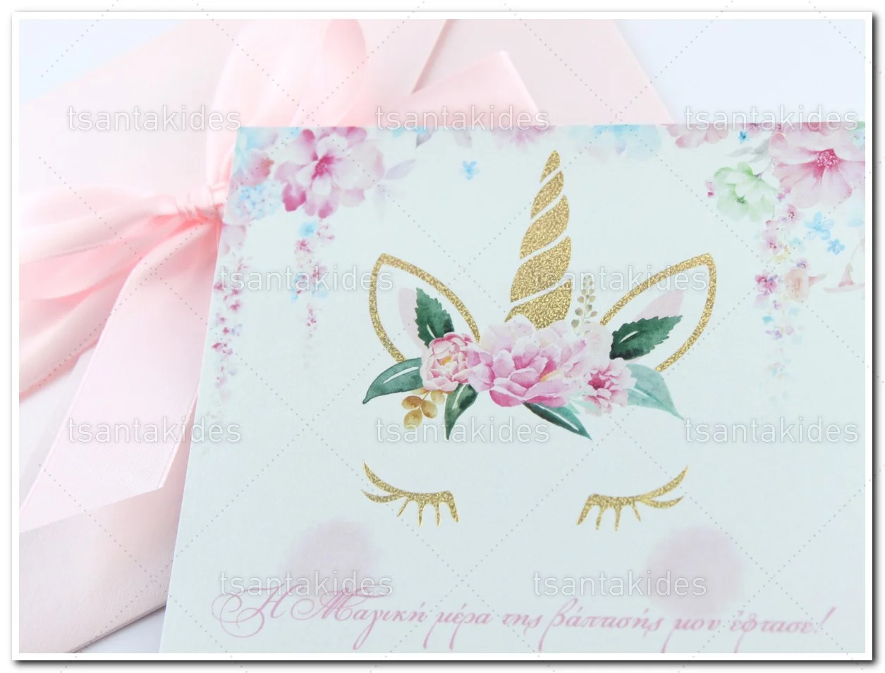 Προσκλητήριο βάπτισης για κορίτσι εκτυπωμένο με θέμα Μονόκερος