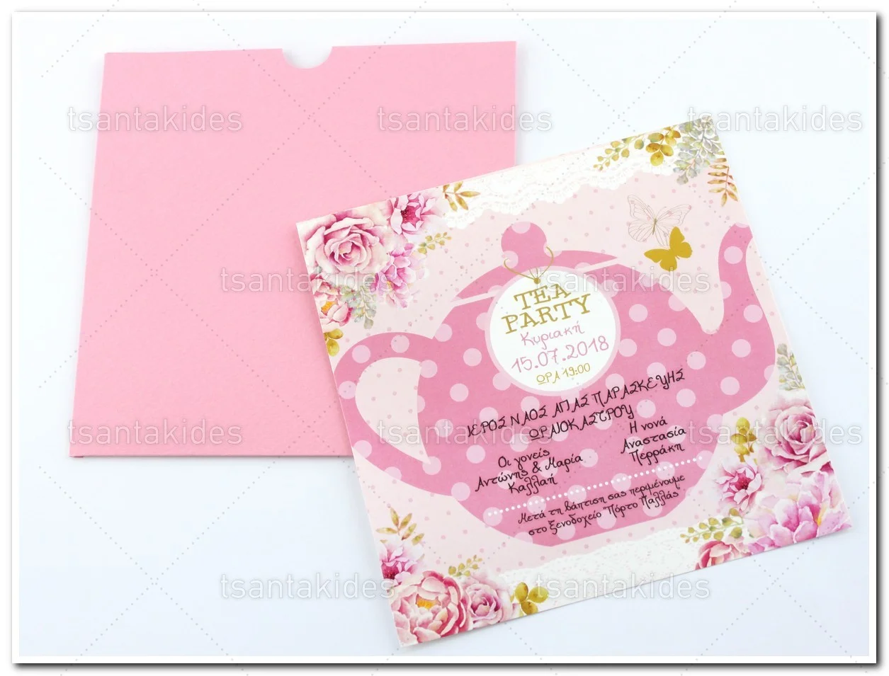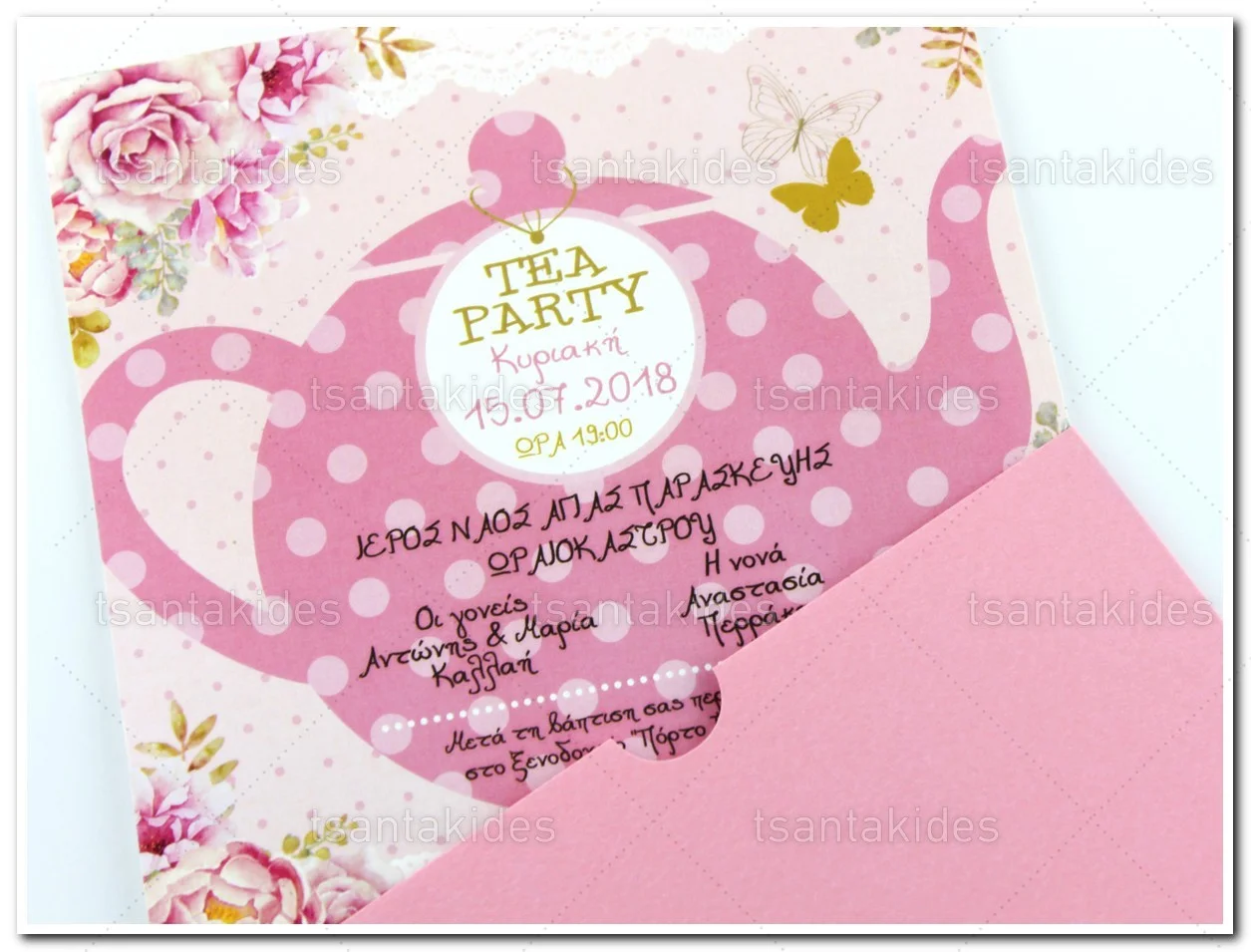 Προσκλητήριο βάπτισης για κορίτσι εκτυπωμένο με θέμα Tea Party
