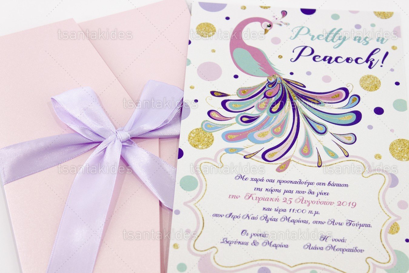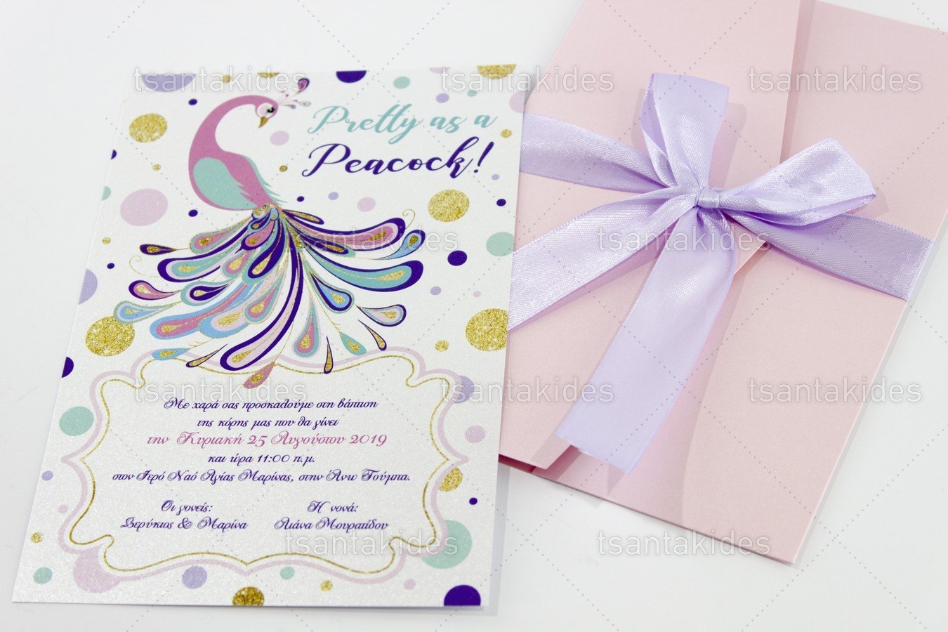 Προσκλητήριο βάπτισης για Κορίτσι εκτυπωμένο με θέμα Pretty as a Peacock