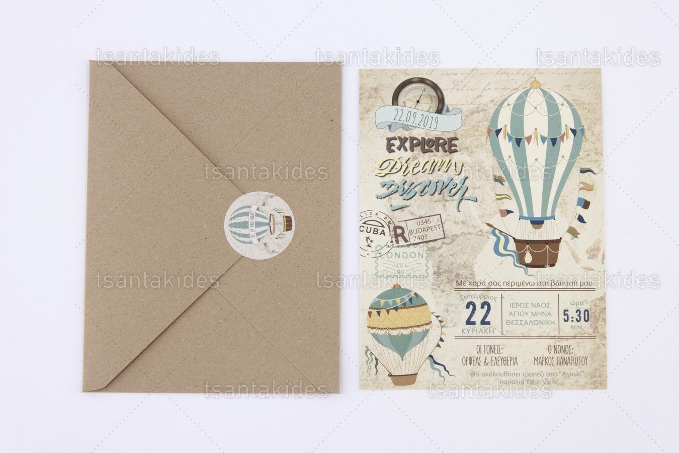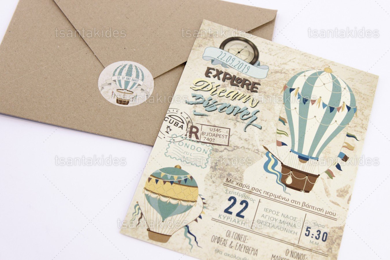 Προσκλητήριο βάπτισης για Αγόρι εκτυπωμένο με θέμα Αερόστατο