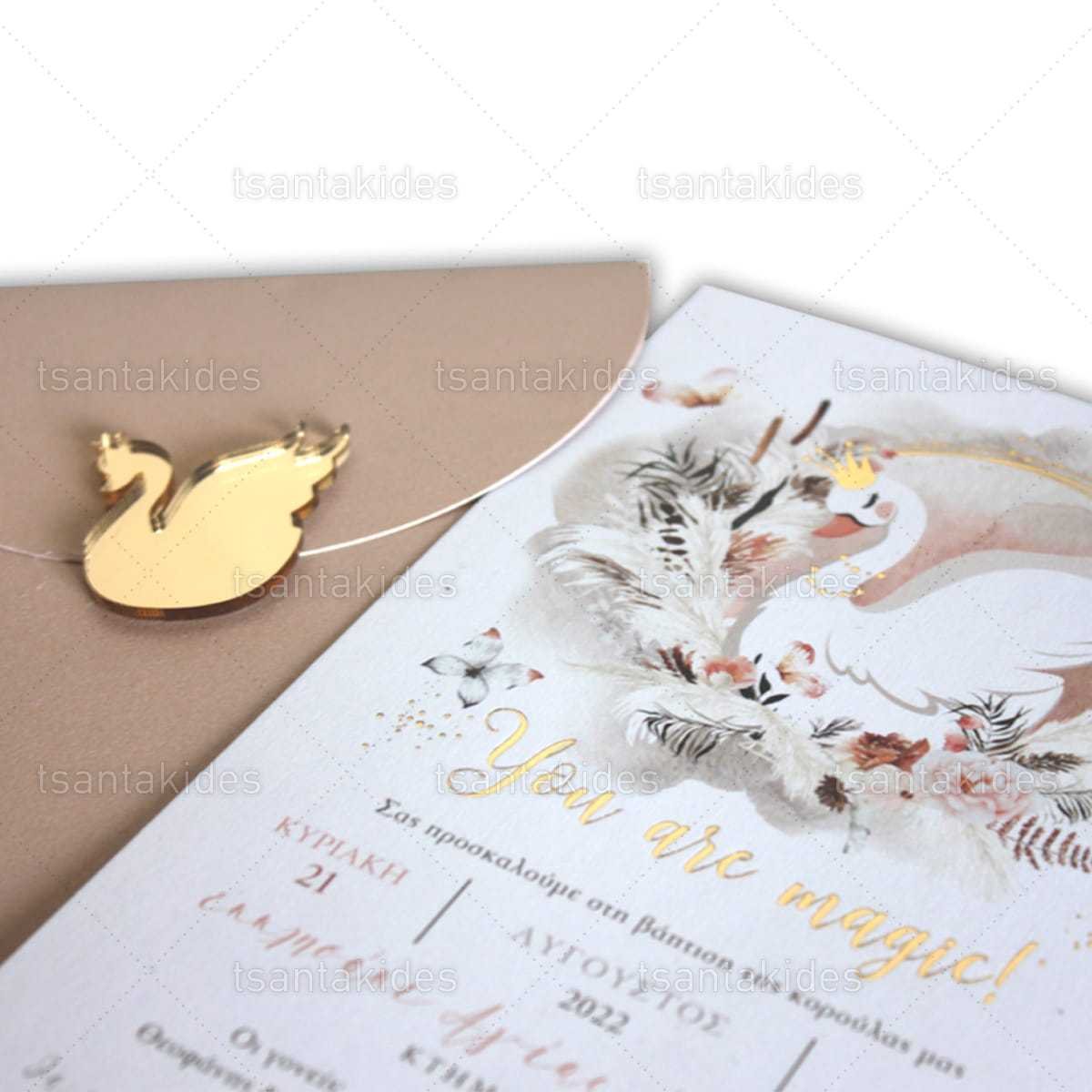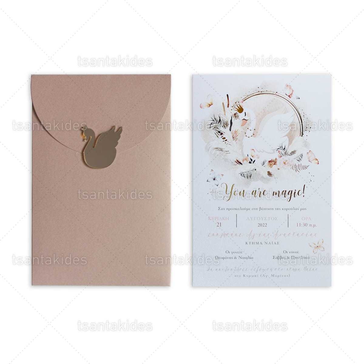 Προσκλητήριο βάπτισης για κορίτσι εκτυπωμένο με θέμα Magic Swan
