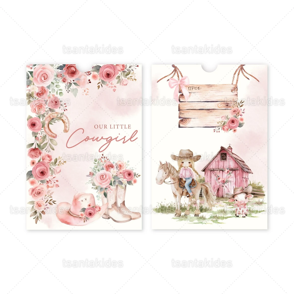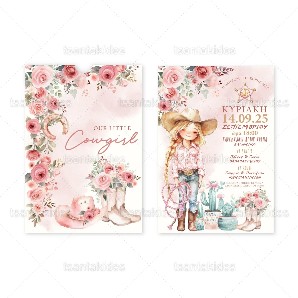 Προσκλητήριο βάπτισης για κορίτσι εκτυπωμένο με θέμα Cowgirl