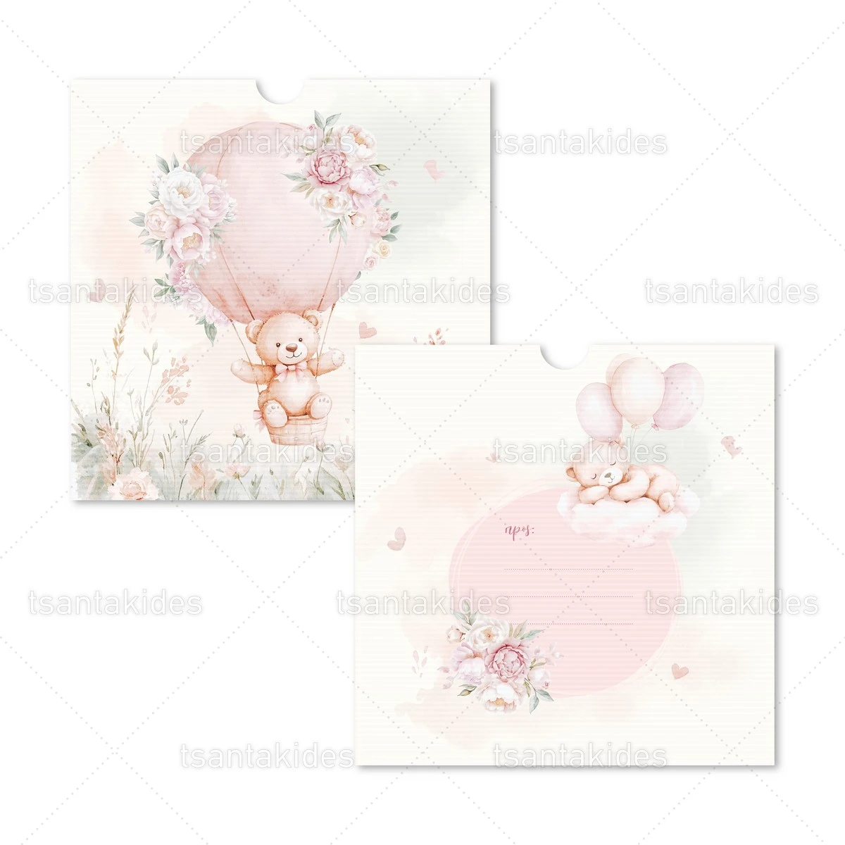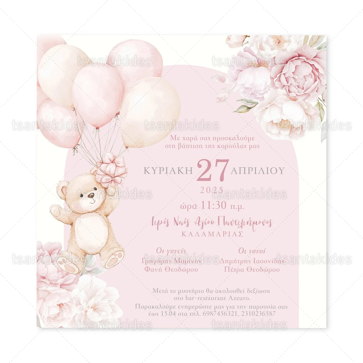 Προσκλητήριο βάπτισης για κορίτσι εκτυπωμένο με θέμα Pink Teddy Bear