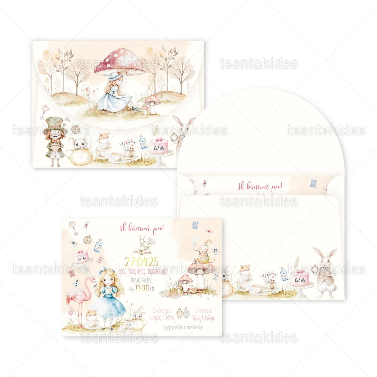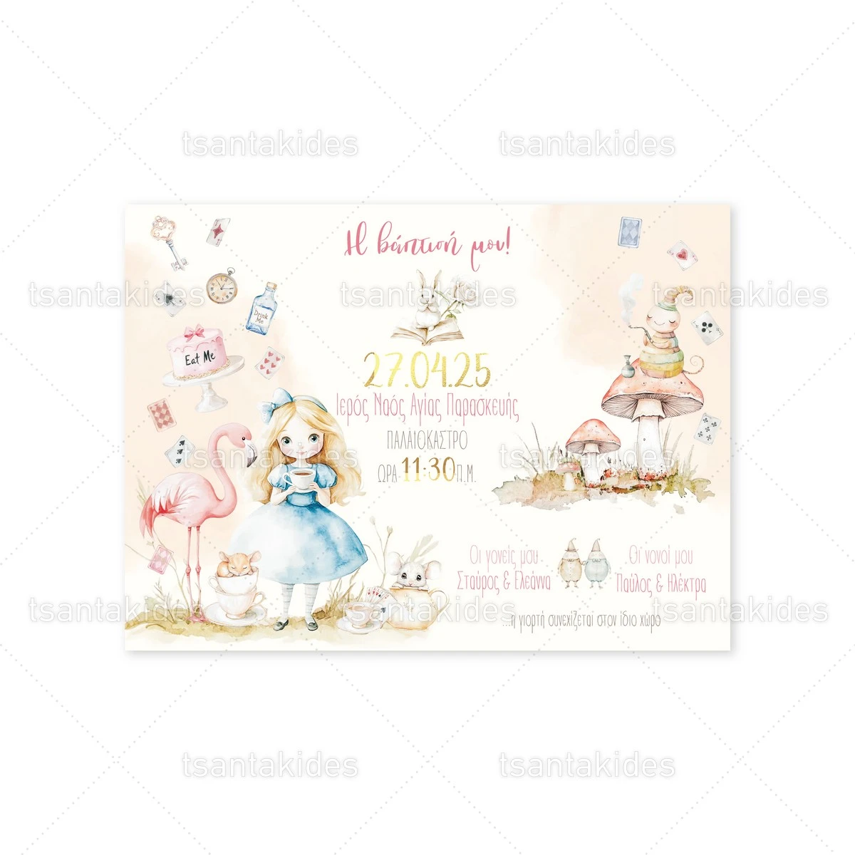 Προσκλητήριο βάπτισης για κορίτσι εκτυπωμένο με θέμα Alice In Wonderland