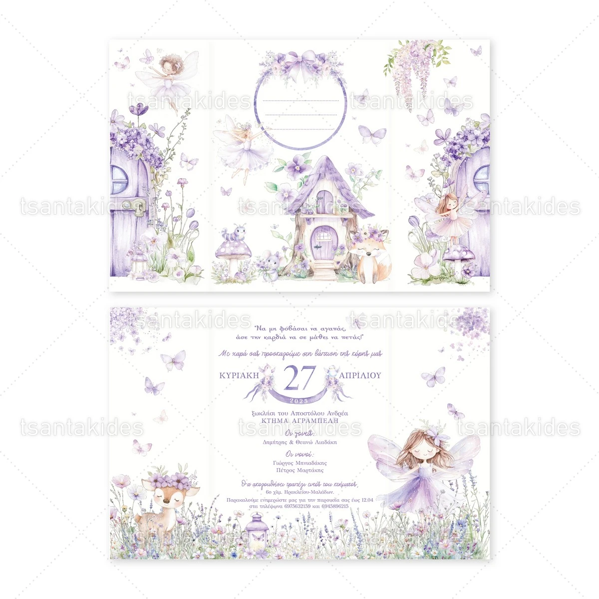 Προσκλητήριο βάπτισης για κορίτσι εκτυπωμένο με θέμα Violet Fairies