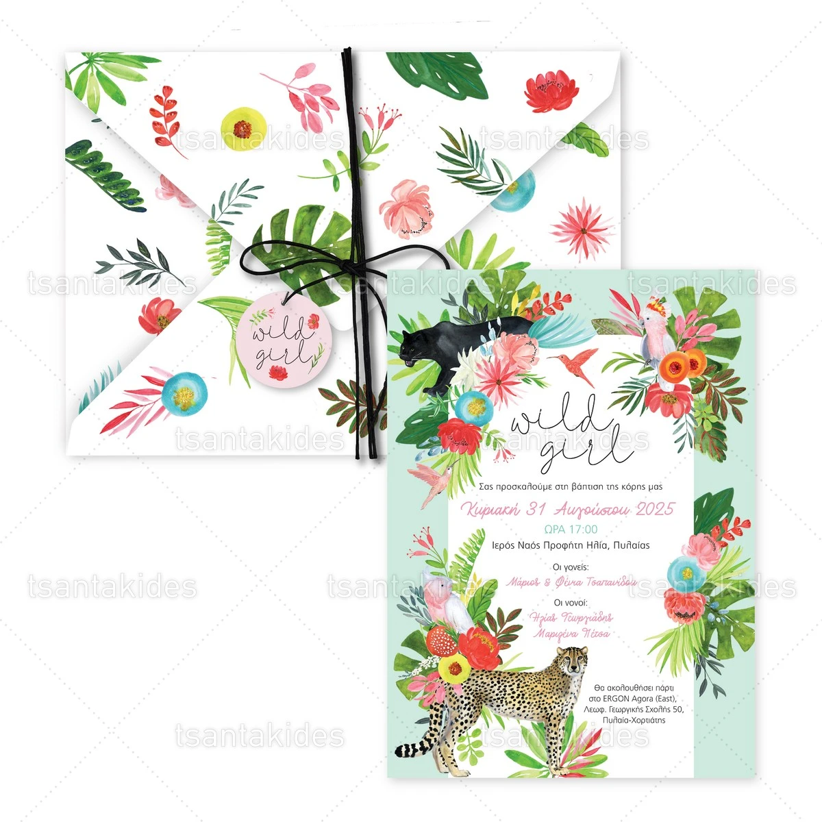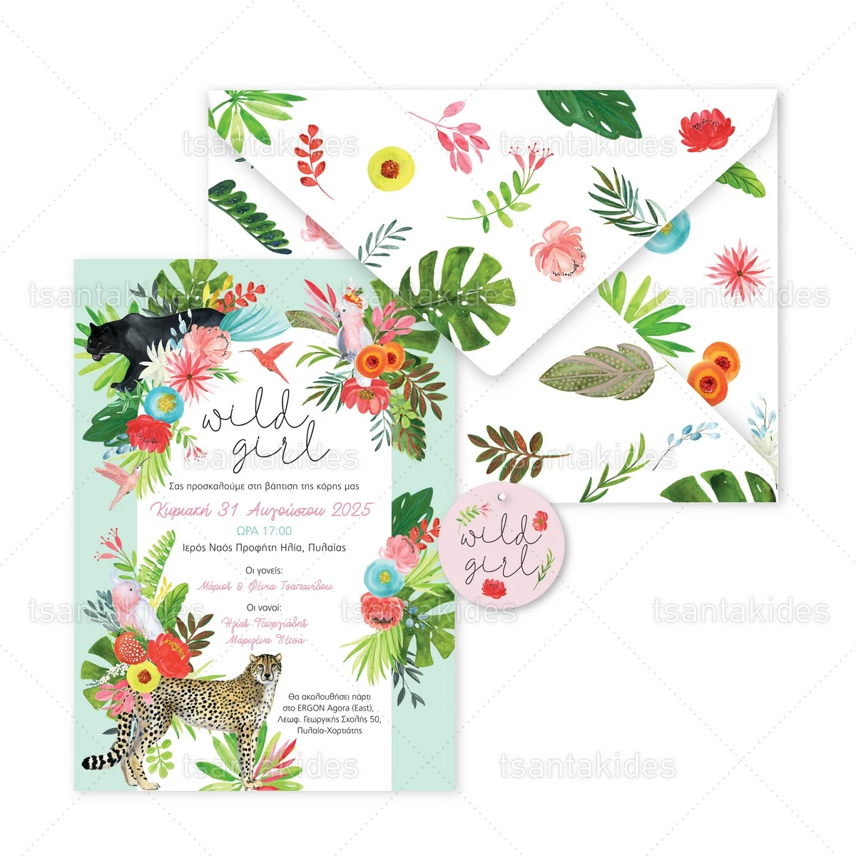 Προσκλητήριο βάπτισης για κορίτσι εκτυπωμένο με θέμα Coral Jungle
