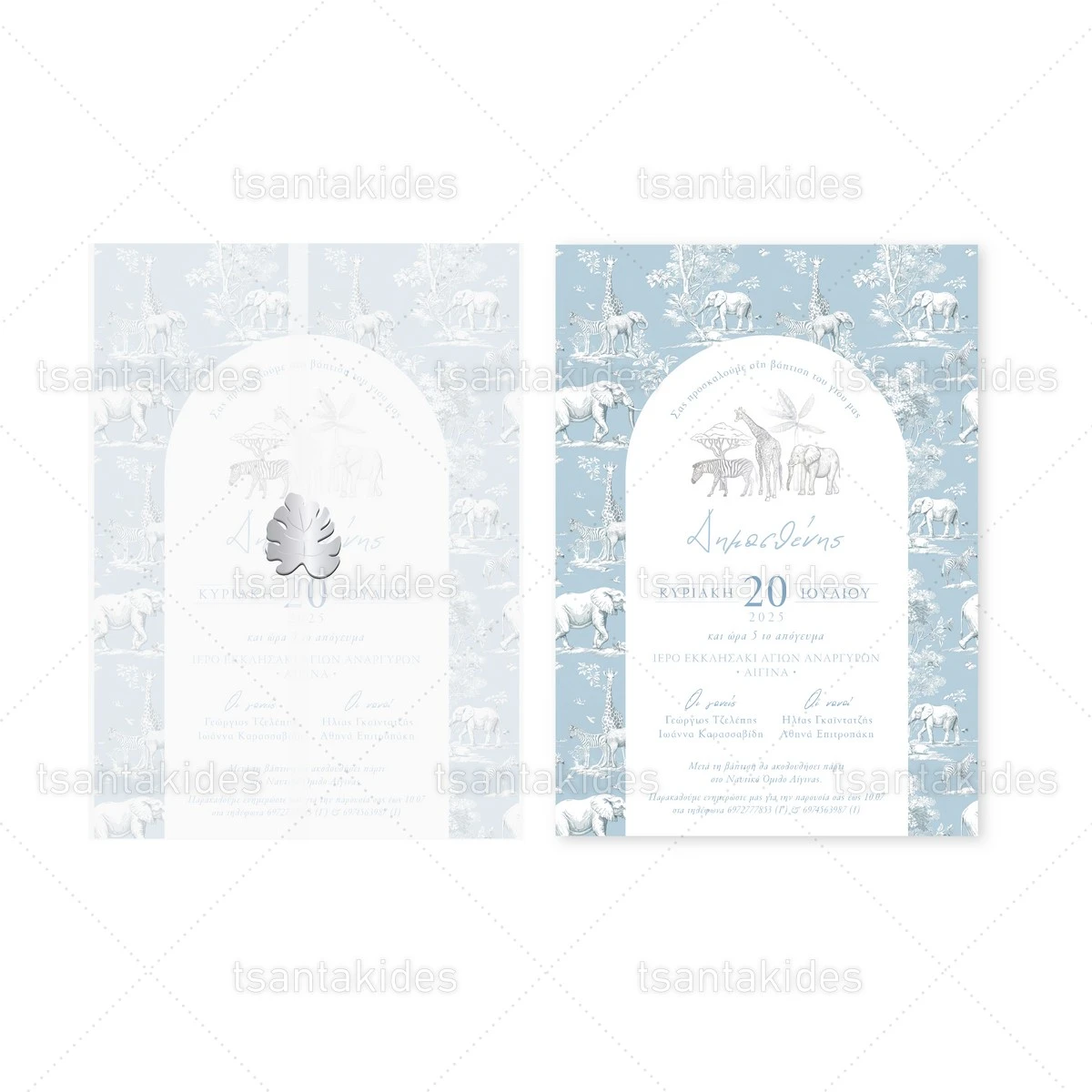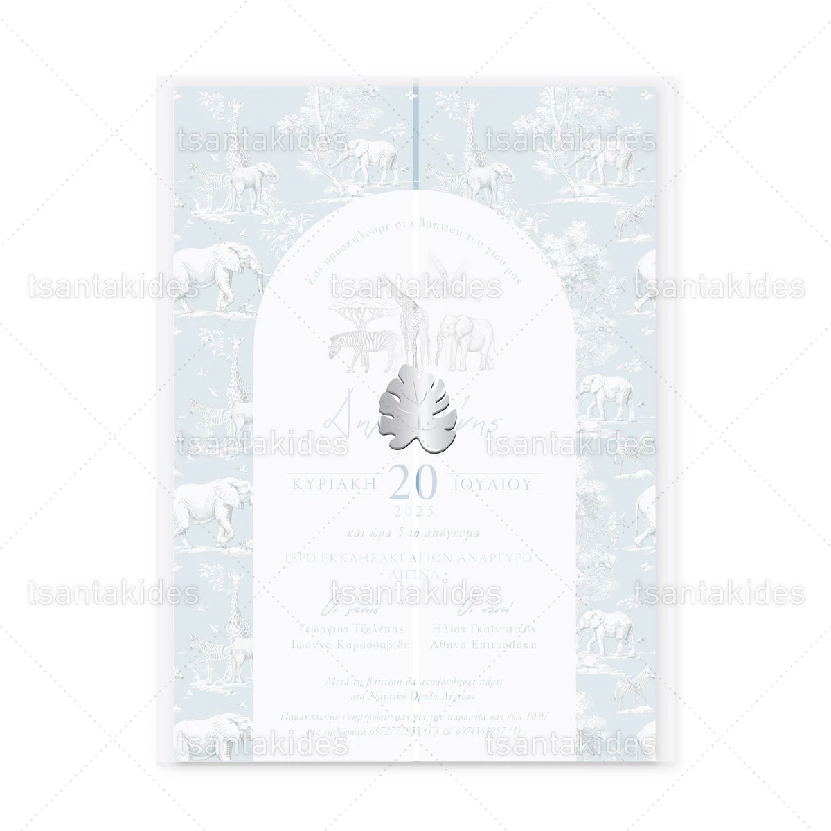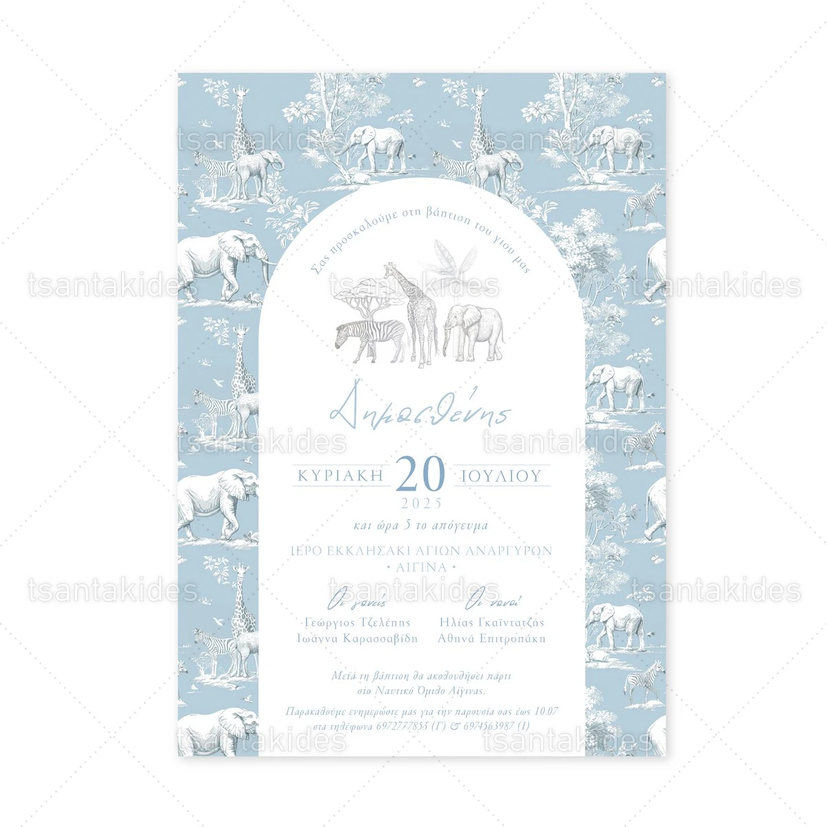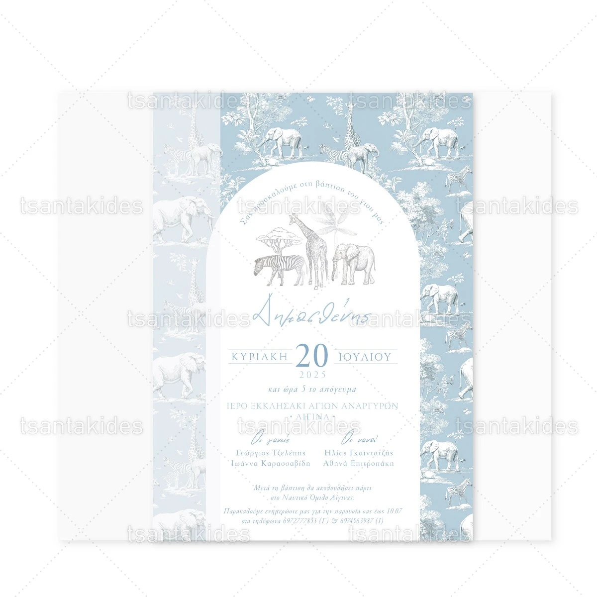 Προσκλητήριο βάπτισης για αγόρι εκτυπωμένο με θέμα Dusty Blue Jungle Toile