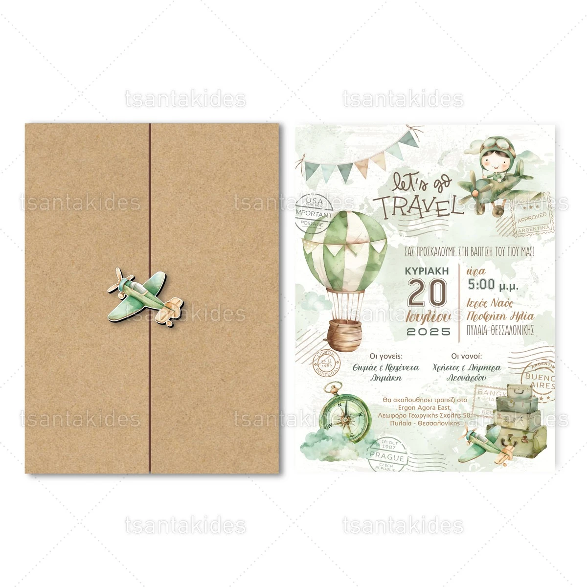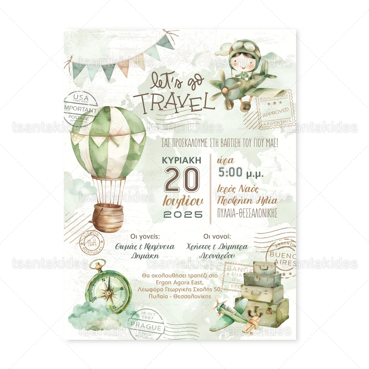 Προσκλητήριο βάπτισης για αγόρι εκτυπωμένο με θέμα Lets Go Travel