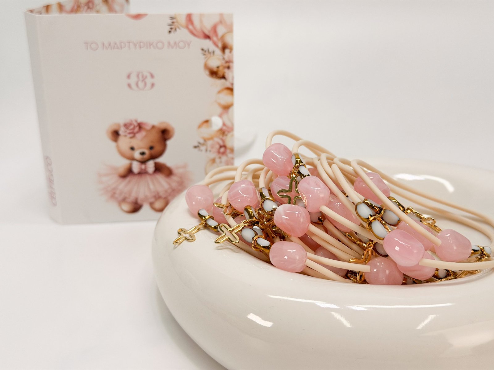 Μαρτυρικό βραχιόλι με καουτσούκ εκρού κορδόνι,ροζ ακρυλική χάντρα,stainless steel σταυρό και δίχρωμες χάντρες σε λευκή-χρυσή απόχρωση.