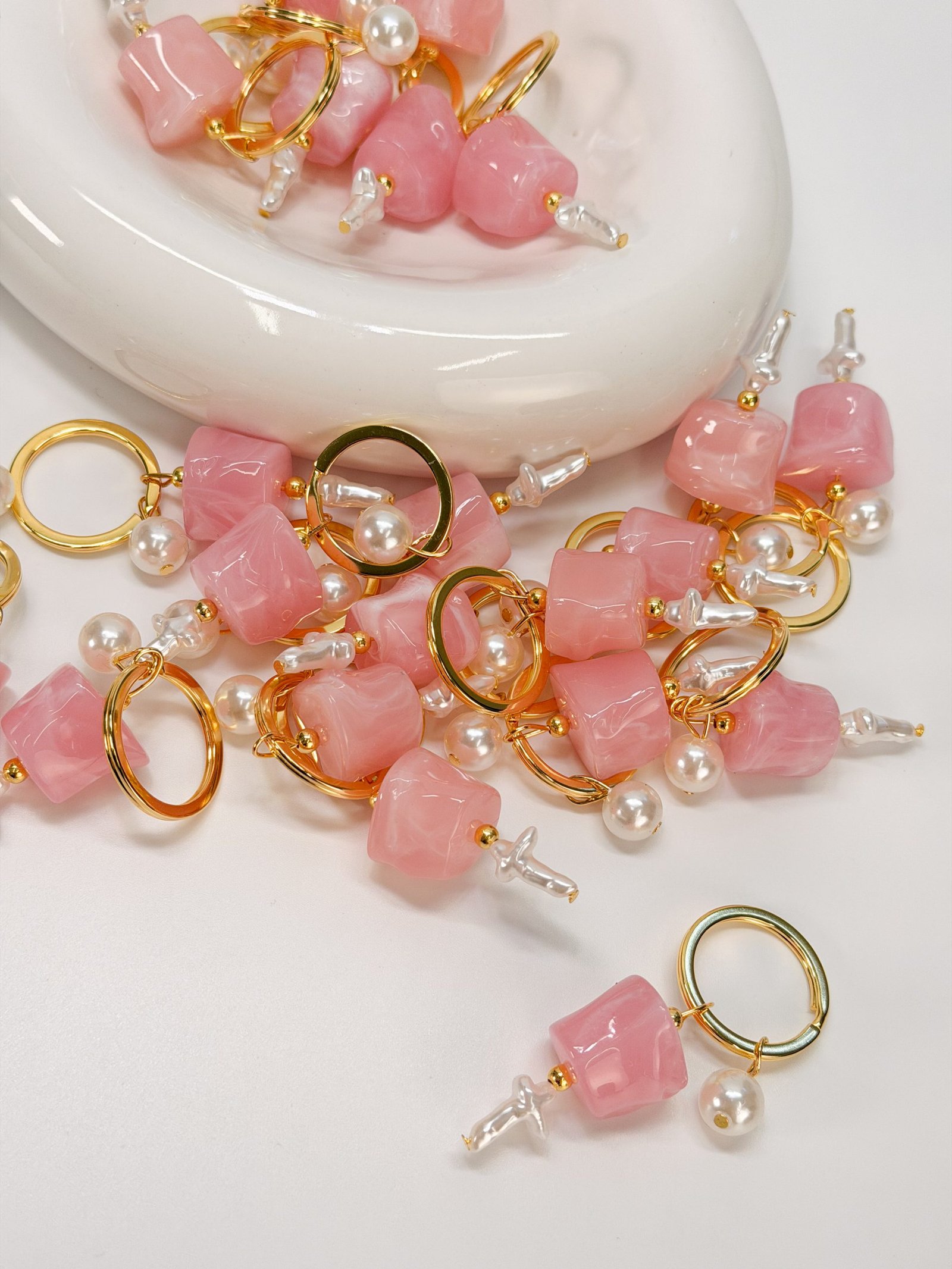 Μαρτυρικό μπρελόκ με ροζ ακρυλική μεγάλη χάντρα, λευκή πέρλα και σταυρό περλέ.