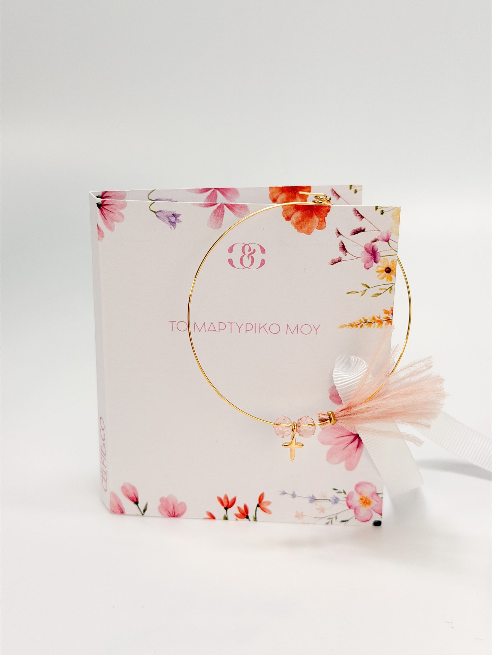 Μαρτυρικό βραχιόλι με memory wire,ροζ κρύσταλλα,επιχρυσωμένο σταυρό και σάπιο μήλο φτερό.