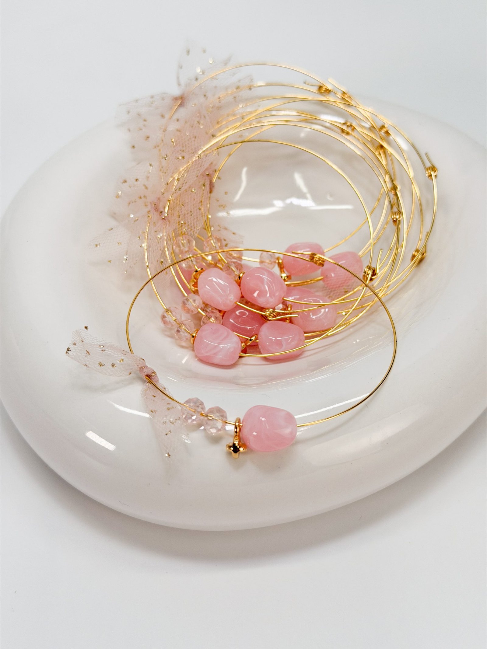 Βραχιόλι μαρτυρικό με memory wire,ροζ χάντρα,κρύσταλλα ροζ, φιογκάκι με δίχρωμη τρέσα ροζ με χρυσα flakes και επιχρυσωμένο σταυρό.