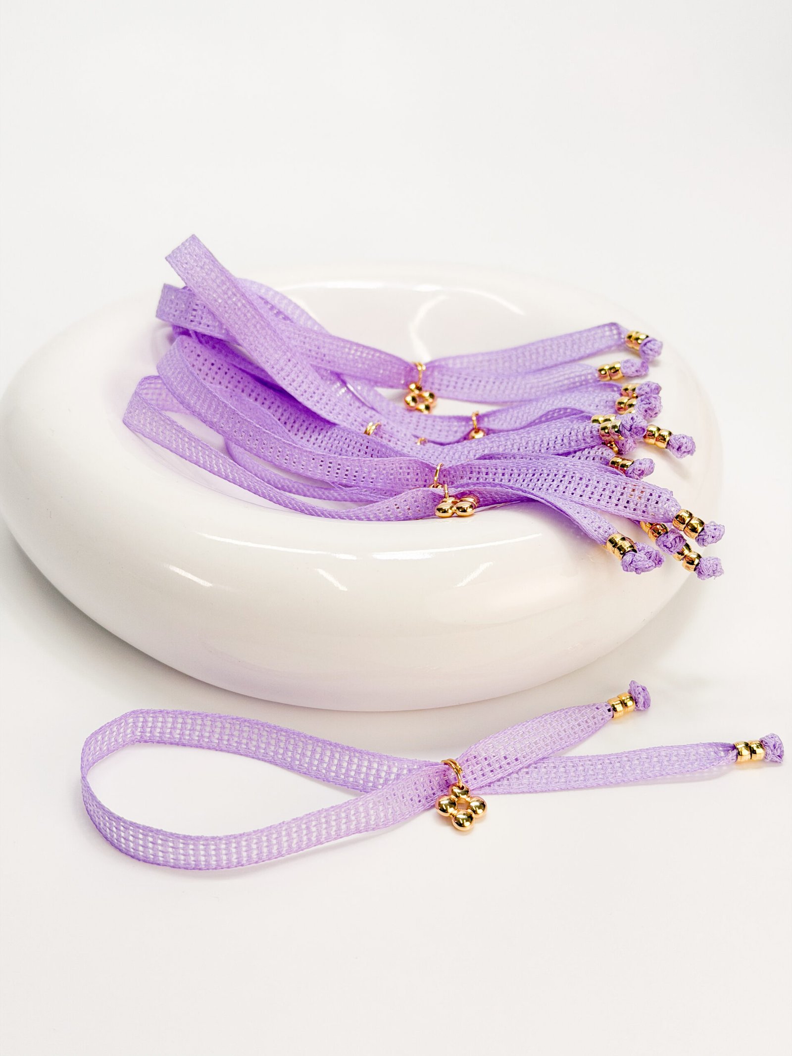 Μαρτυρικό βραχιόλι με φιλντιρέ λιλά κορδέλα και επιχρυσωμένο σταυρό.