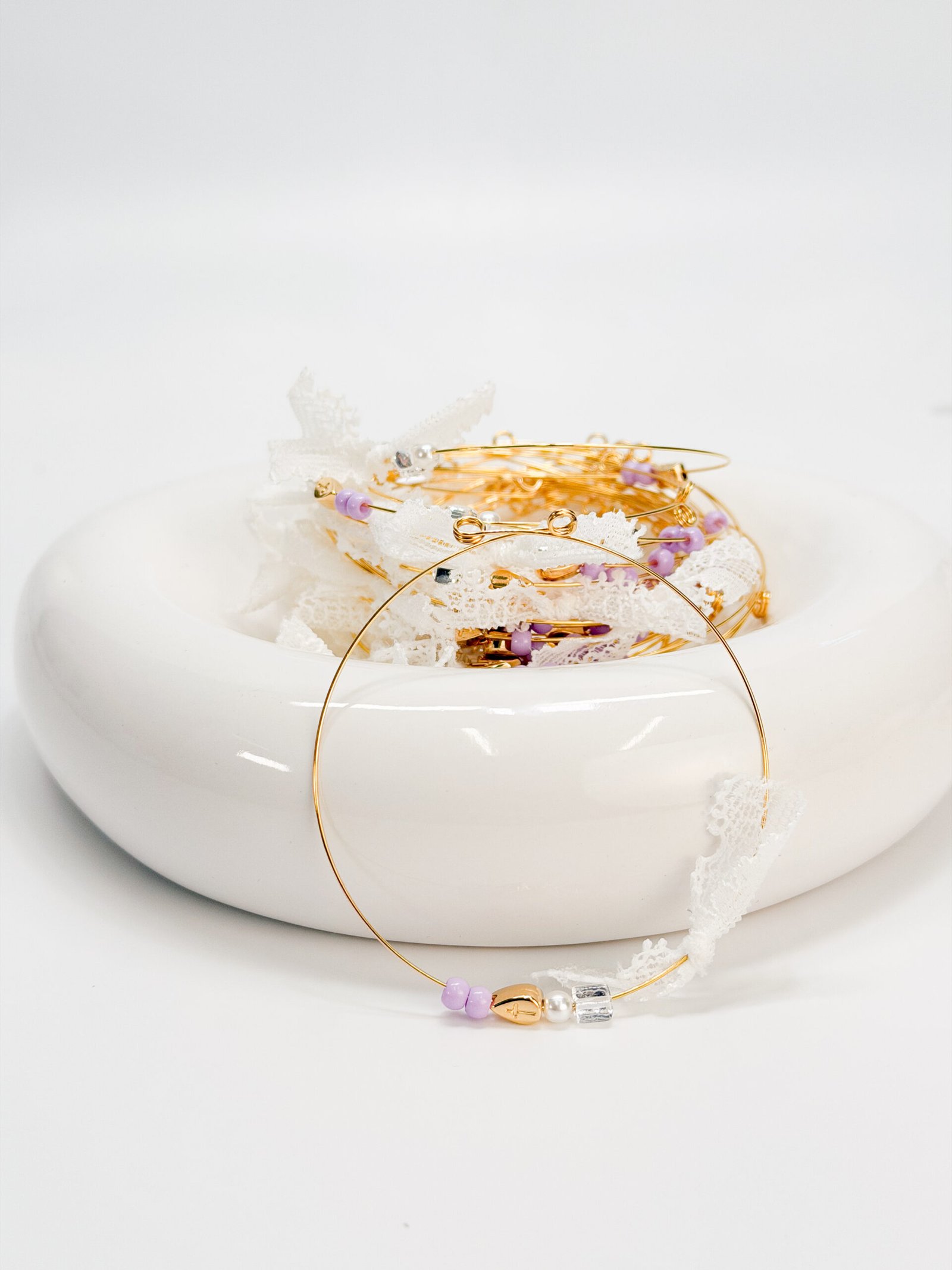 Μαρτυρικό βραχιόλι με memory wire,dαντέλα,λιλά χάντρες και επιχρυσωμένο σταυρό.