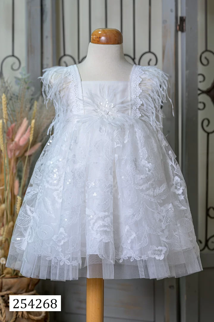 Ρομαντικό και κομψό βαφτιστικό φόρεμα για κορίτσι, φτιαγμένο από φίνα υφάσματα με δαντέλες, τούλι και υπέροχες λεπτομέρειες. Ιδανικό για μια παραμυθένια εμφάνιση που θα κλέψει τις εντυπώσεις!