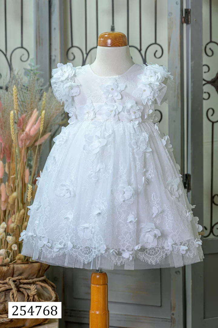 Ρομαντικό και κομψό βαφτιστικό φόρεμα για κορίτσι, φτιαγμένο από φίνα υφάσματα με δαντέλες, τούλι και υπέροχες λεπτομέρειες. Ιδανικό για μια παραμυθένια εμφάνιση που θα κλέψει τις εντυπώσεις!