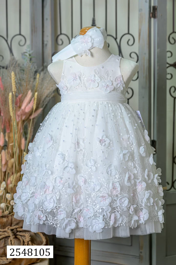 Ρομαντικό και κομψό βαφτιστικό φόρεμα για κορίτσι, φτιαγμένο από φίνα υφάσματα με δαντέλες, τούλι και υπέροχες λεπτομέρειες. Ιδανικό για μια παραμυθένια εμφάνιση που θα κλέψει τις εντυπώσεις!