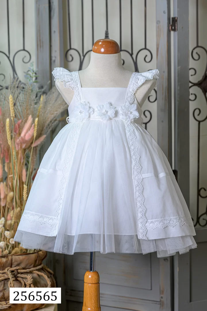 Ρομαντικό και κομψό βαφτιστικό φόρεμα για κορίτσι, φτιαγμένο από φίνα υφάσματα με δαντέλες, τούλι και υπέροχες λεπτομέρειες. Ιδανικό για μια παραμυθένια εμφάνιση που θα κλέψει τις εντυπώσεις!