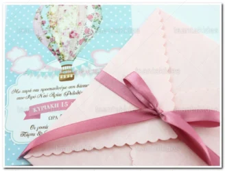 Προσκλητήριο βάπτισης για κορίτσι εκτυπωμένο με θέμα Αερόστατο