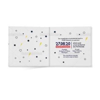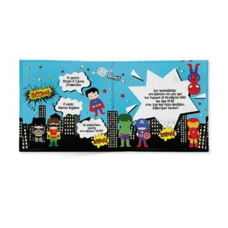 Προσκλητήριο σκληρό καπάκι,  παραμυθάκι μικρό, εκτυπωμένο με θέμα  superheroes