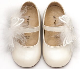 Δερμάτινο Γοβάκι Μονή Μπαρέτα με Χειροποίητο Διακοσμητικό Πεταλούδα και Πούπουλα σε Εκρού Χρώμα