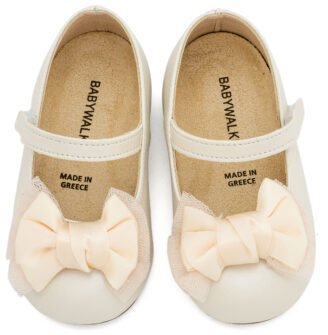 Δερμάτινο Γοβάκι Μονή Μπαρέτα με Διακοσμητική Σατέν Φιόγκο σε Εκρού Χρώμα