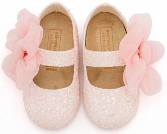 Glitter Γοβάκι Μονή Μπαρέτα Διακοσμημένο με Μεγάλο Λουλούδι Οργάντζας σε Ροζ Χρώμα
