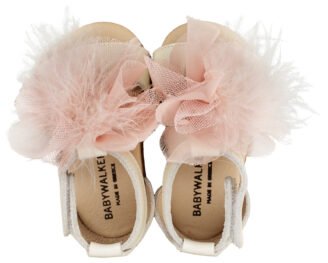 Δερμάτινο Σαμπό Διακοσμημένο με Χειροποίητο Chiffon Λουλούδι και Πούπουλα από Δέρμα Πέρλα σε Εκρού Ροζ Χρώμα